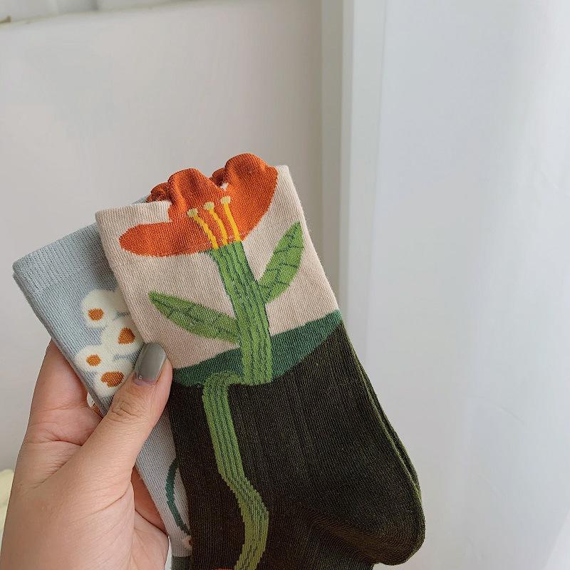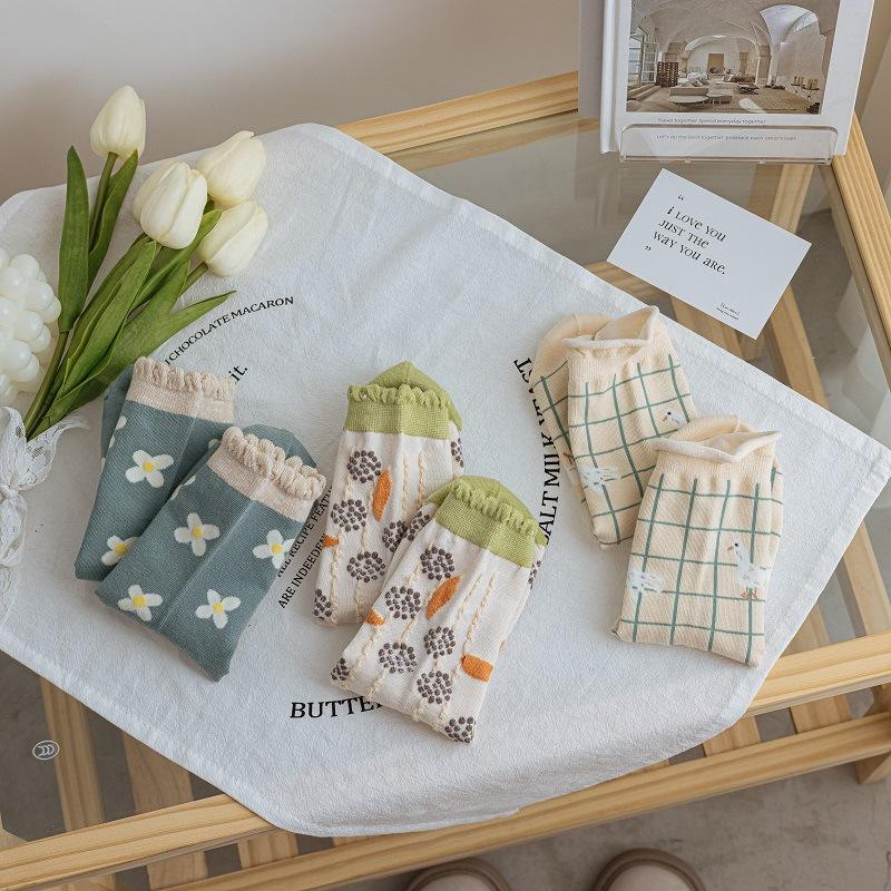 2022 Spring Ins Curly Edge Nouveauté Fresh Floral Birds Square Cotton Crew Chaussettes pour femme