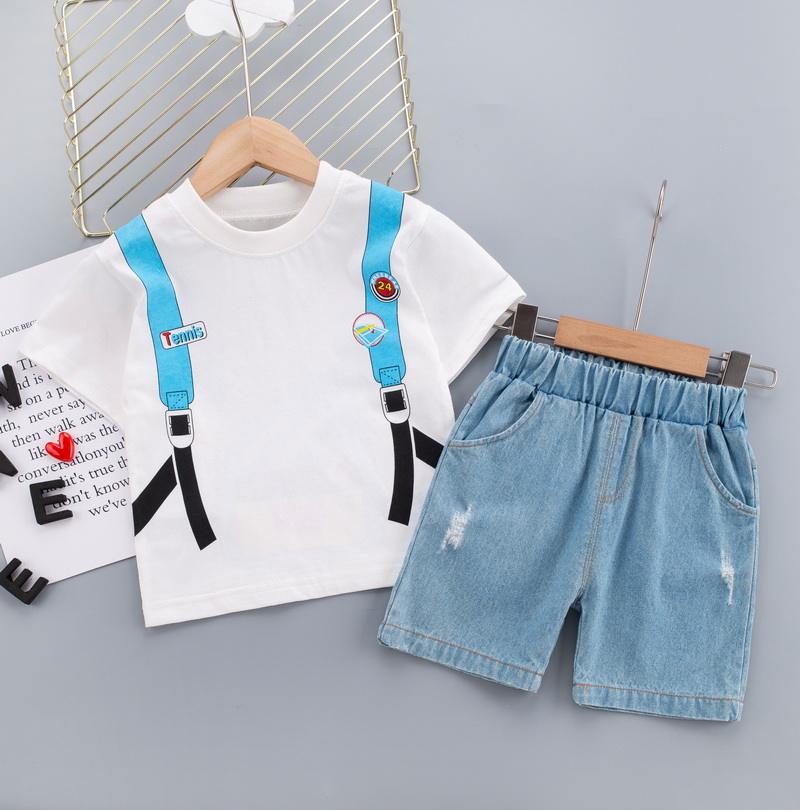 Ensemble d'été 2022 personnalisé de haute qualité pour enfants : T-shirt à motif sac d'école et short en jean pour bébés garçons