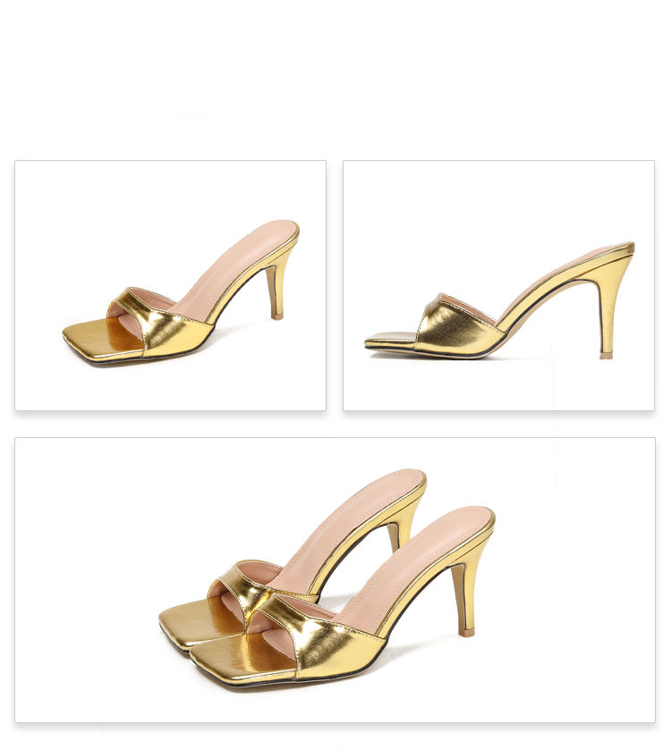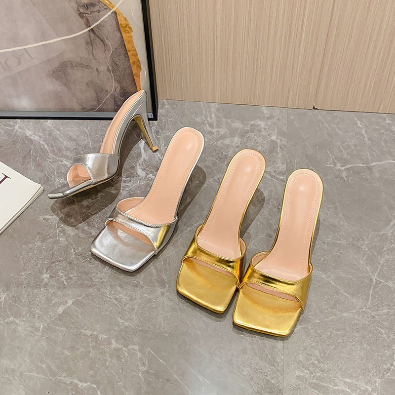 Chaussures mule à talon fin de style européen 2023, sandales à bout ouvert, pour femmes, or et argent