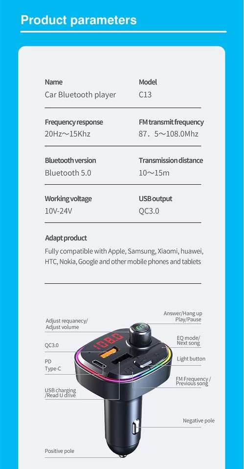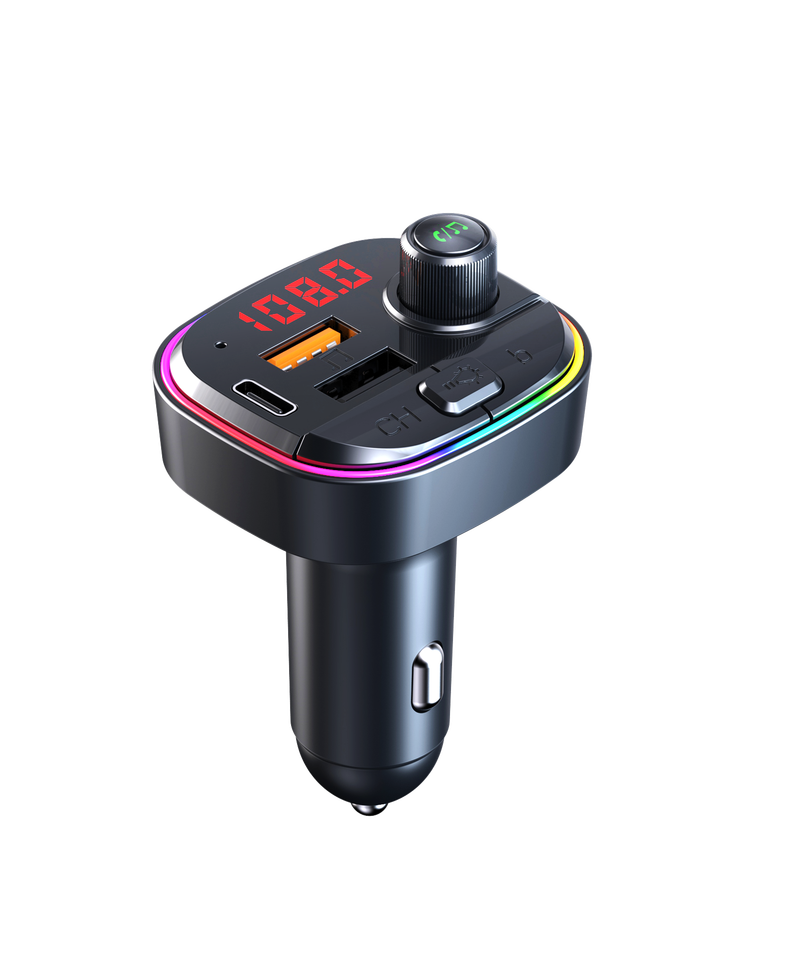 Nouveauté 2023 7+1 lumières colorées C13 Lecteur MP3 de voiture BT Émetteur FM de voiture USB QC3.0+PD Chargeur rapide