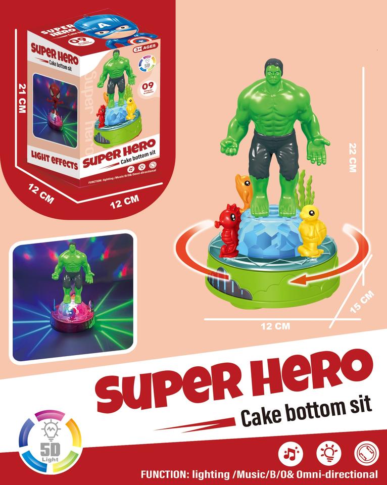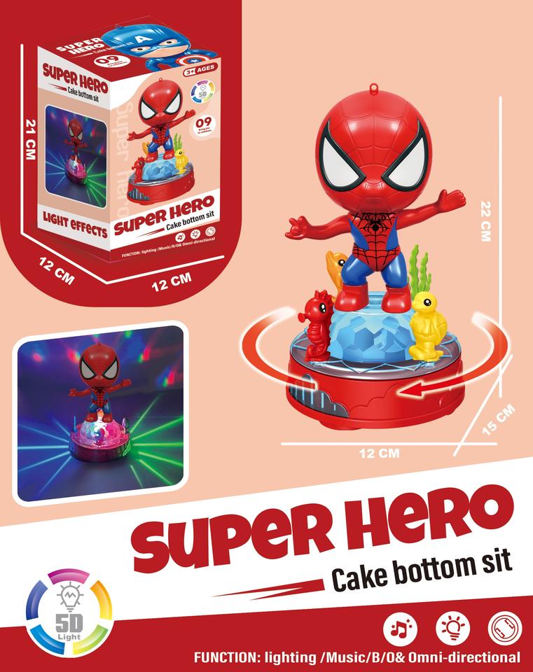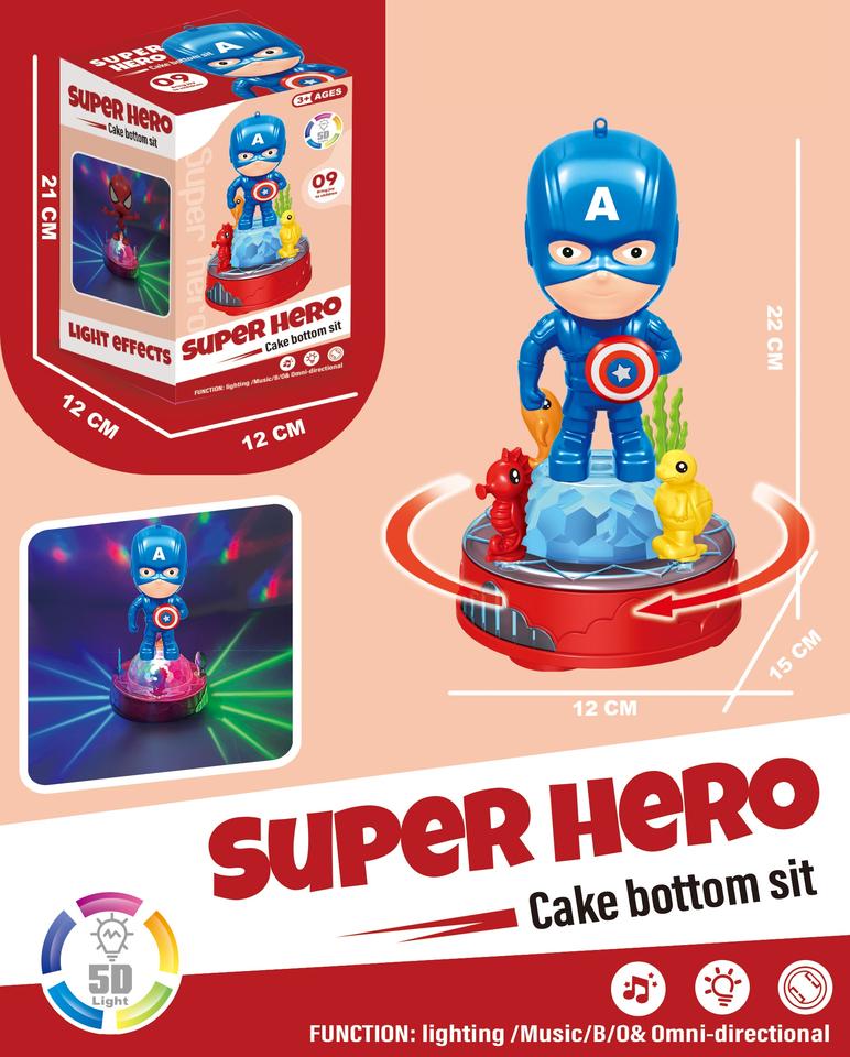 Nouveauté 2023 : Jouet musical pour enfants, figurine de super-héros de cascadeur universelle avec lumière rotative électrique et quatre bases de gâteau interchangeables