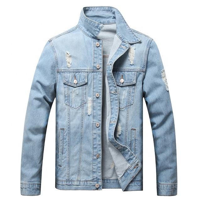 Veste en jean bleu de haute qualité avec logo personnalisé 2023, 100% coton, col montant en cuir véritable pour homme, vente en gros ODM