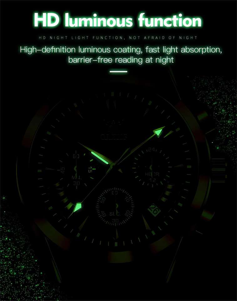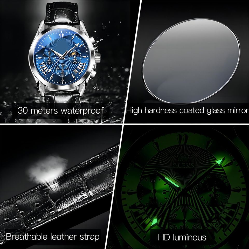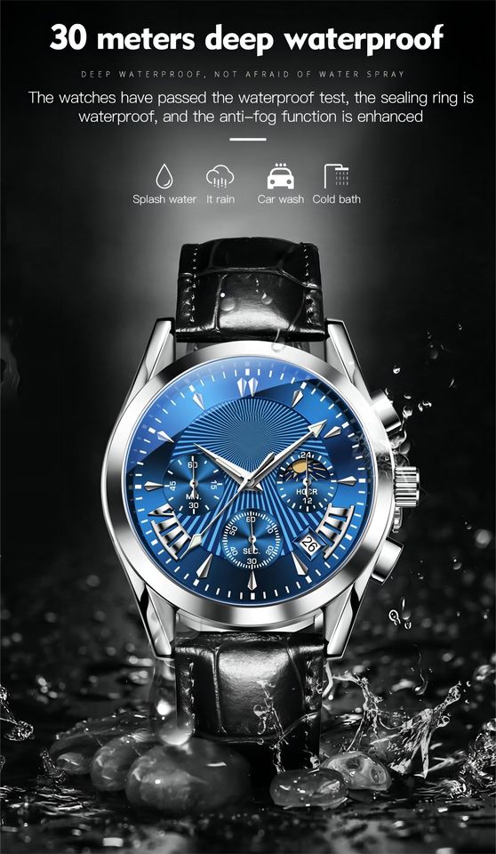 Dispositif:Date automatique, Chronographe, Jour/date, Phase de lune, Résistant à l'eau, Imperméable, Lumineux