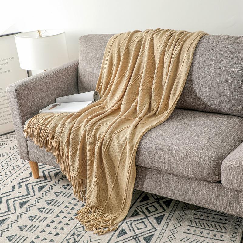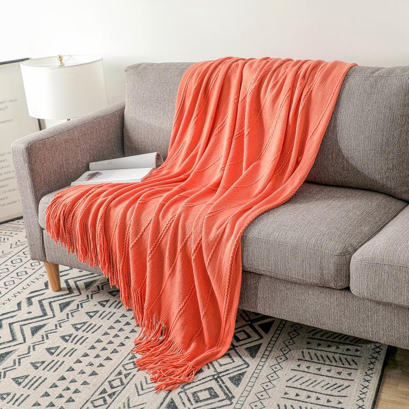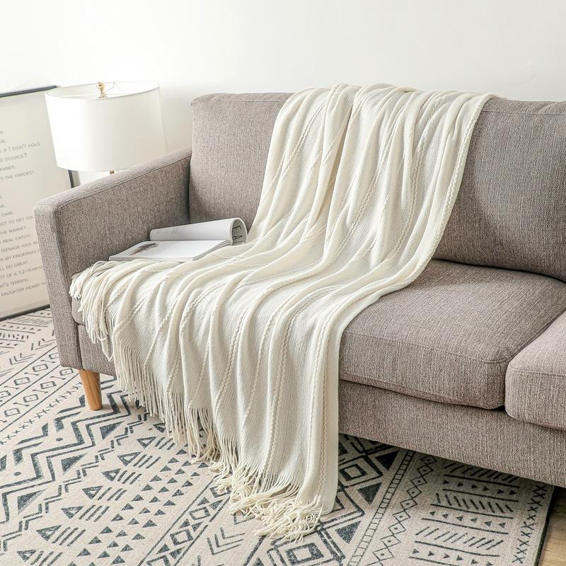 Couverture en laine acrylique de couleur unie 2023 avec couverture rayée tricotée à glands