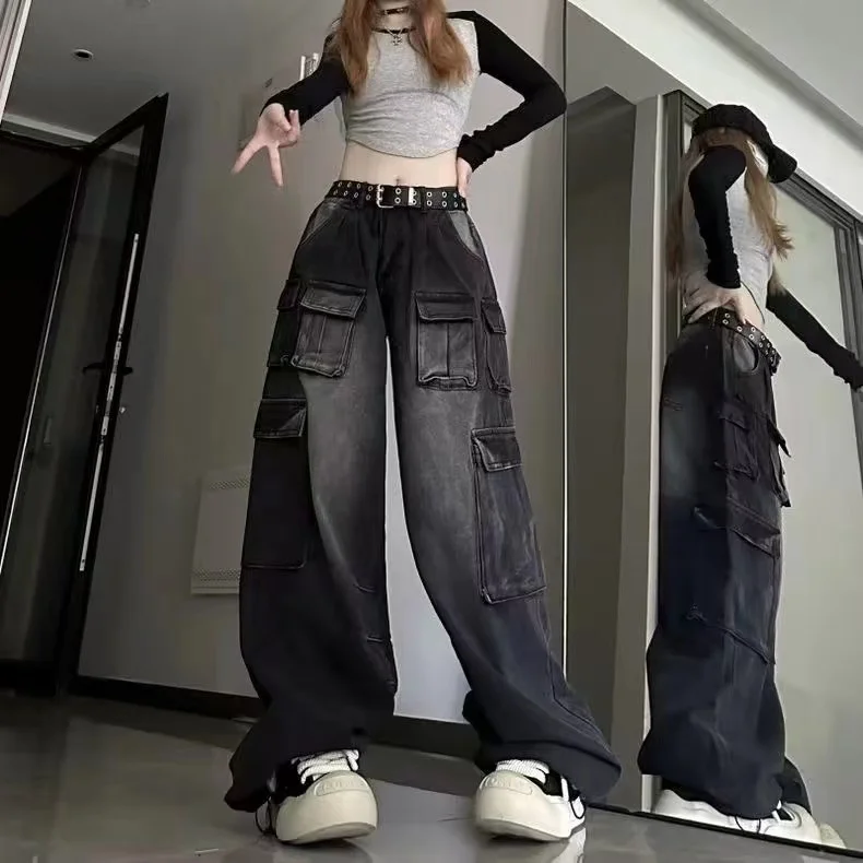 2023 Summer High-Street Women's Cargo Pants Multi-Pocket Design Wide-Leg Baggy High-Waisted Jeans Niche Washable Y2K Style