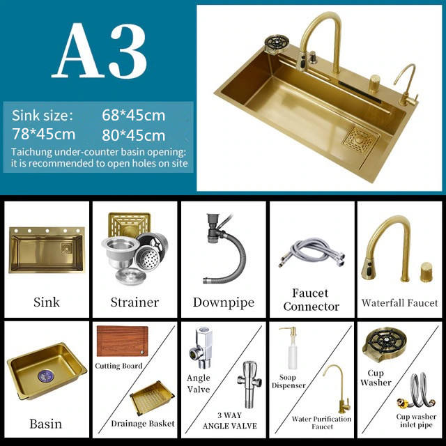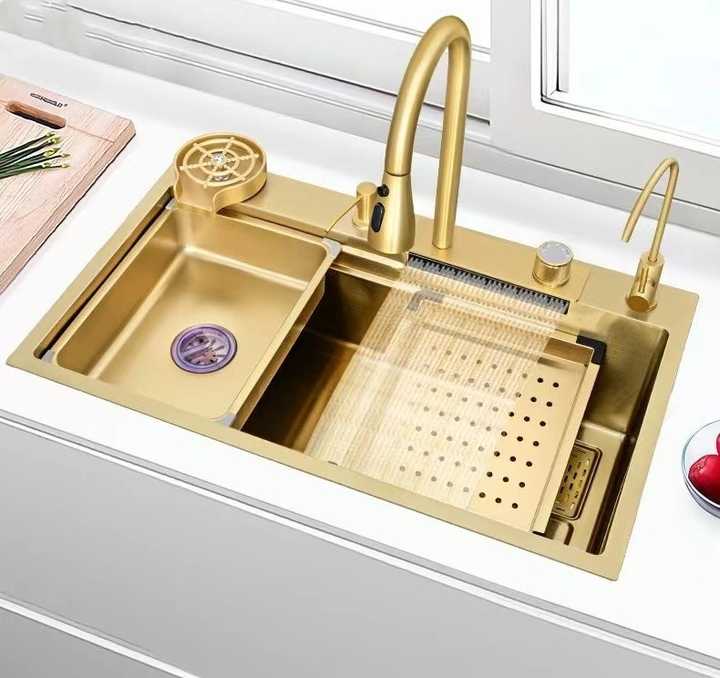 2023 Tiktok 30 32 pouces évier cascade doré or 304 robinet en acier inoxydable évier de cuisine fait à la main