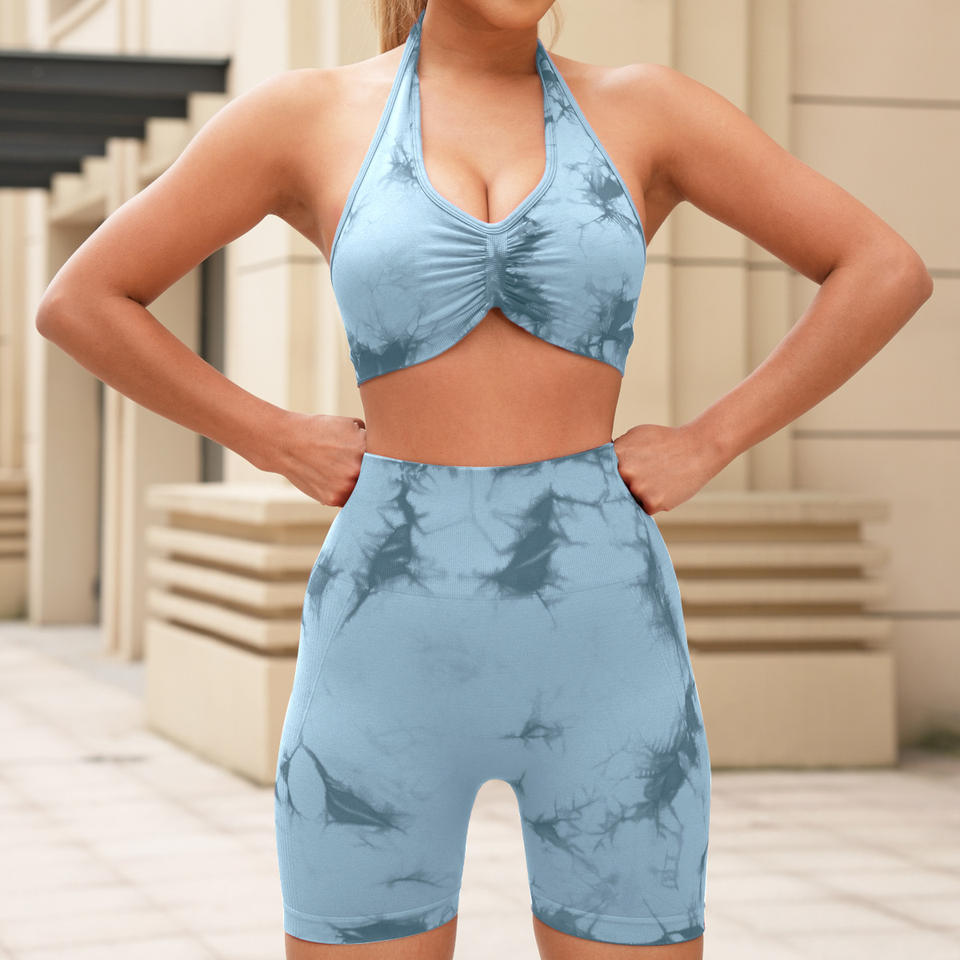 2023 Women's Seamless Summer Yoga Suit Set Sexy Hanging Neck Exposed Back Sports Bra with High Waist Hip-Lifting Shorts Set