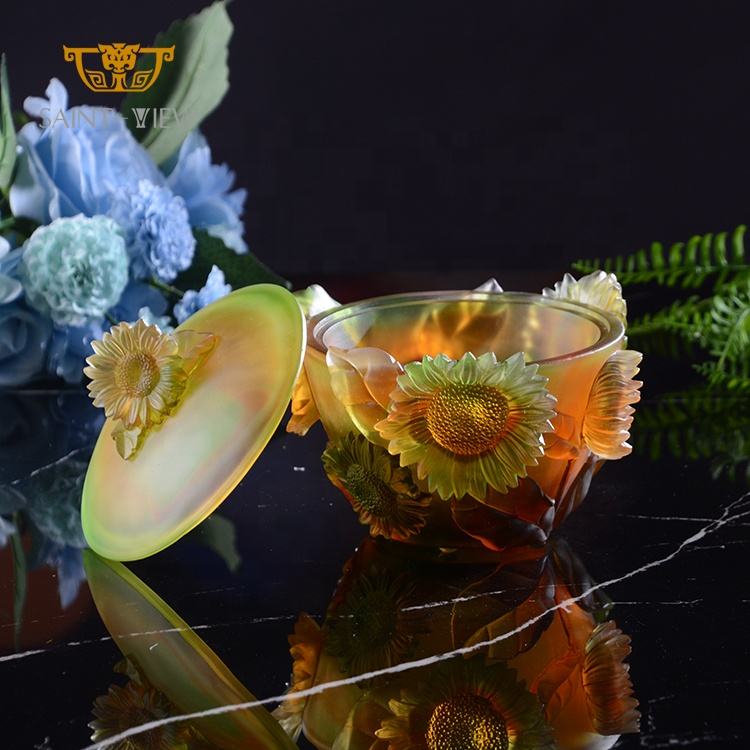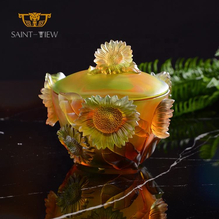 2024 Best Selling SAINT-VIEW Amber Crystal Polished Glass Sunflower Sugar Jar Desk Ornaments Office Decoration