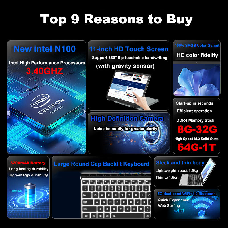 Tablette PC 2 en 1 Intel N100 2024, nouvelle, écran tactile rotatif à 360 degrés, netbook personnel, 11 pouces, écran tactile Intel Yoga, ordinateur portable pour étudiants