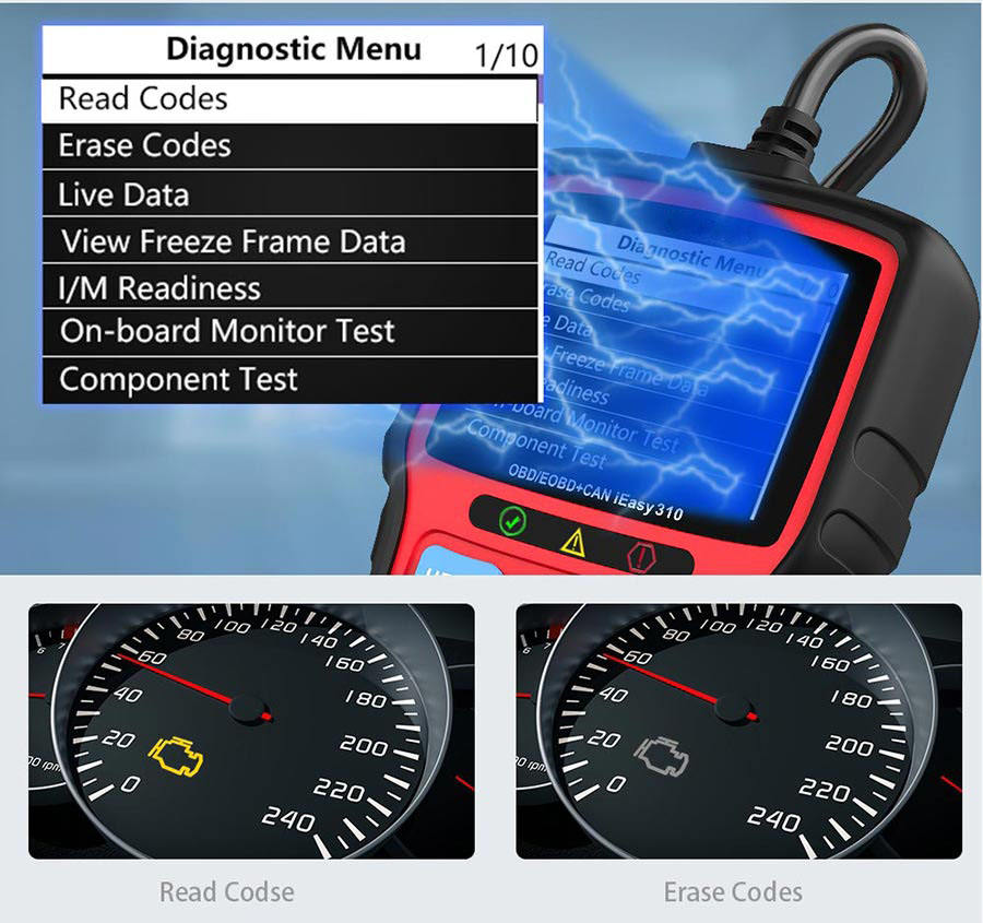 Modes de test OBDII:Lecture des codes, Effacement des codes, Données en direct, Affichage des données figées, Préparation I/M