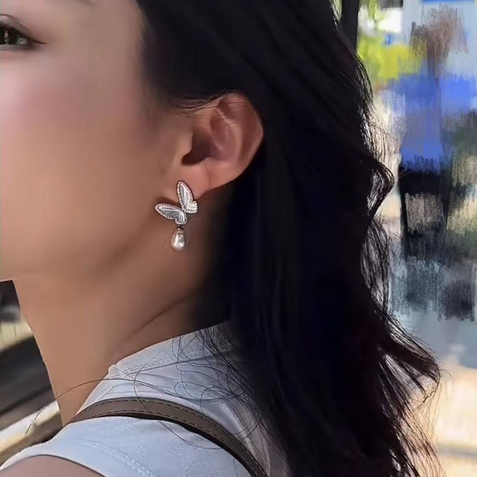 2024 New Minimalist French Butterfly Pearl Dangle Earrings Fashionable and Elegant with Light Luxury Touch