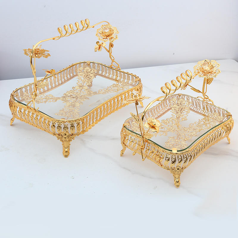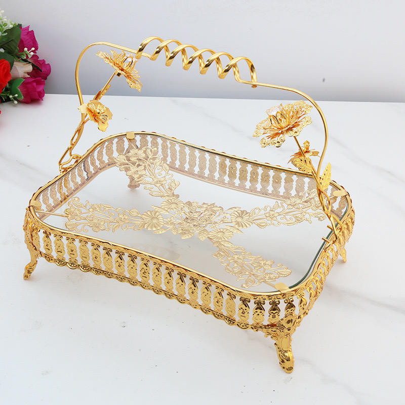 Panier à fruits rectangulaire doré de style 2024, plateau à fruits de luxe en or, plateau à gâteau moderne pour l'Aïd et les mariages
