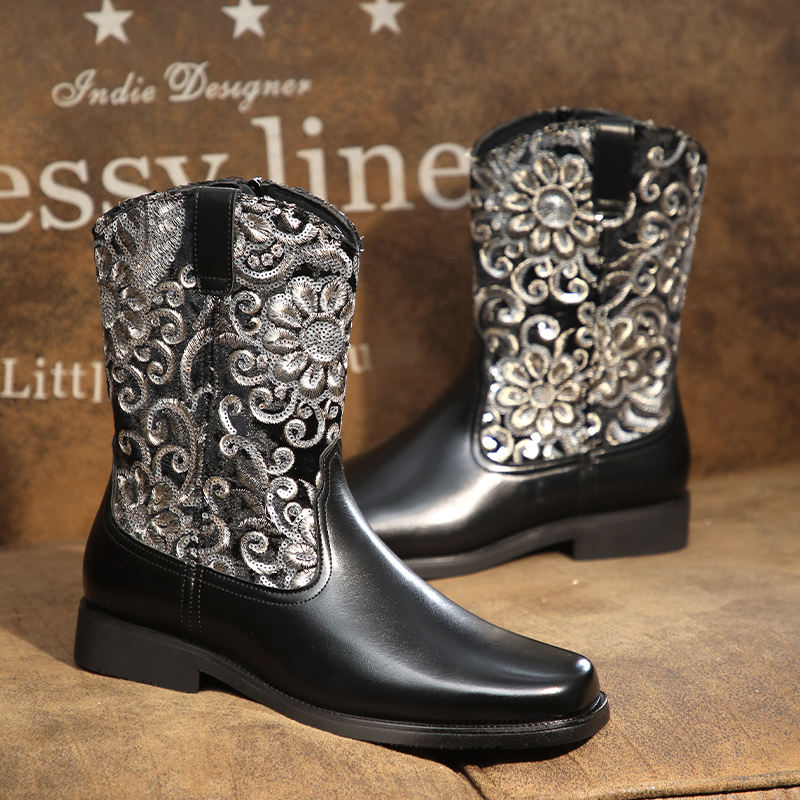 Nouvelle tendance 2024, bottes de cow-boy en cuir brodé bicolore noir et marron pour femmes et hommes