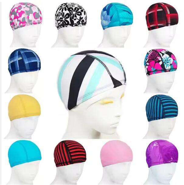 2024 OEM différentes couleurs Nylon bonnet de bain Spandex tissu maillot de bain avec Logo personnalisé conception forme adulte enfant chapeaux de bain