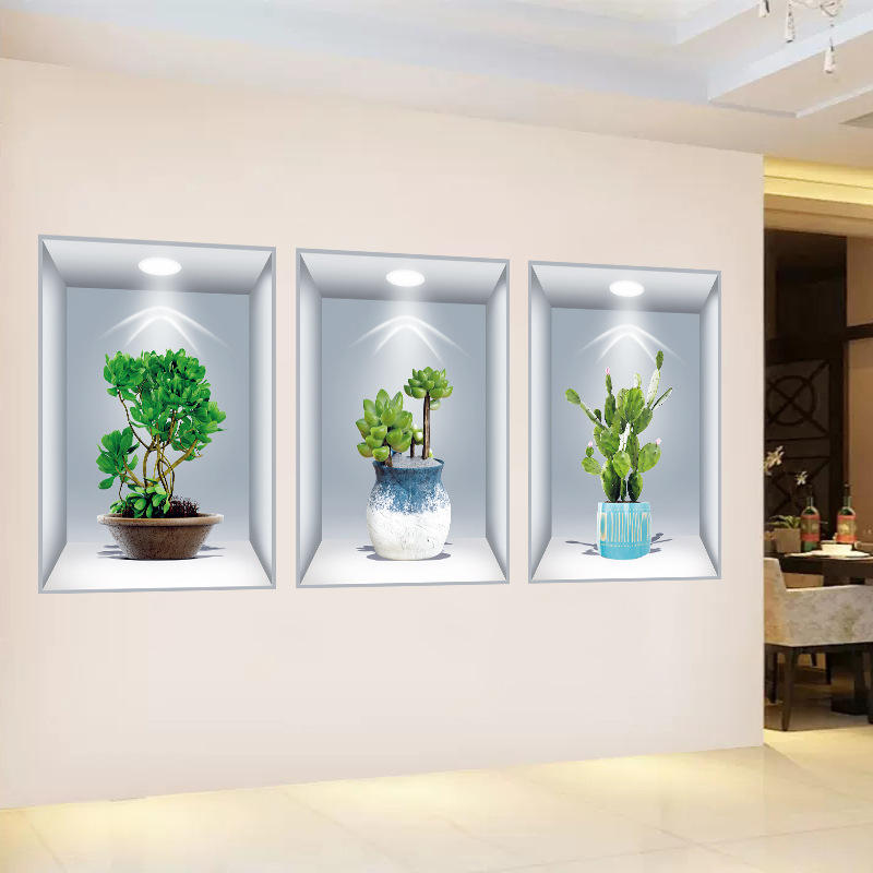 Réutilisable:Autocollant mural plante en pot rose, cadre photo 3D