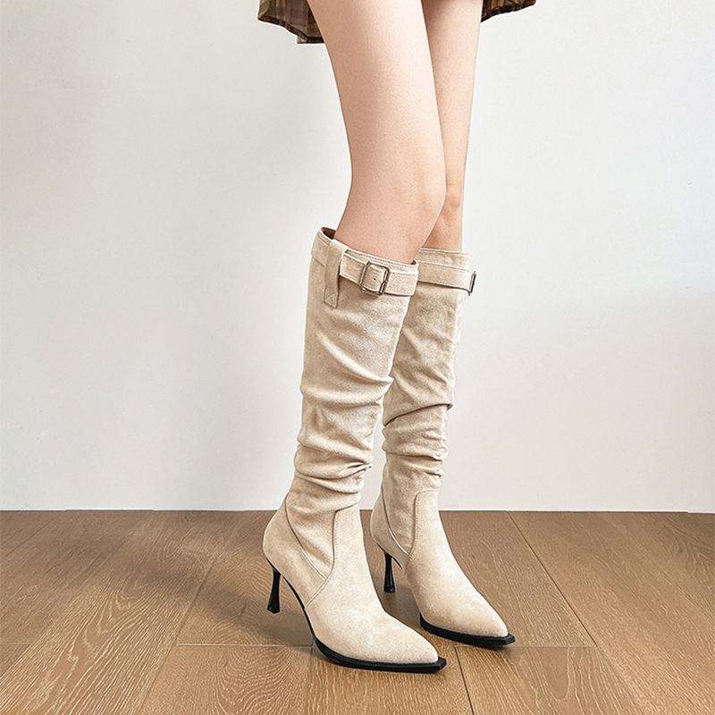 2024 hiver nouveau chaud ajouter velours haute bidon botte daim talons aiguilles longue bidon botte mode Simple femmes longue botte