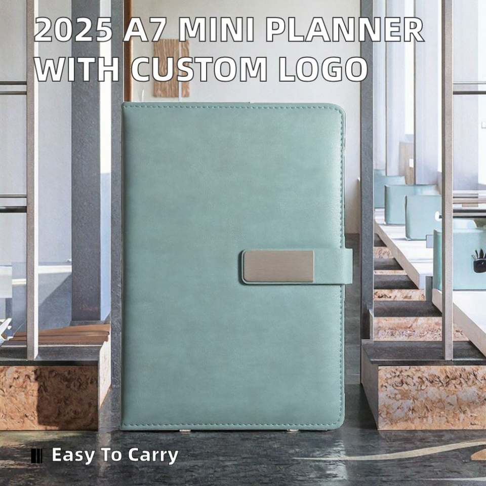 Carnet A5 2025 en anglais avec logo personnalisé, agenda quotidien 365 jours, mini-agenda portable, couverture en cuir pour l'éducation