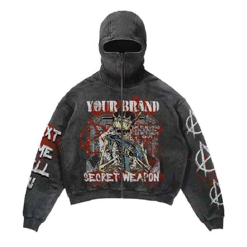 2025 lavage à l'acide cagoule visage complet sweats à capuche zippés pour hommes Style Ninja Streetwear masque complet Vintage sweats à capuche lourds