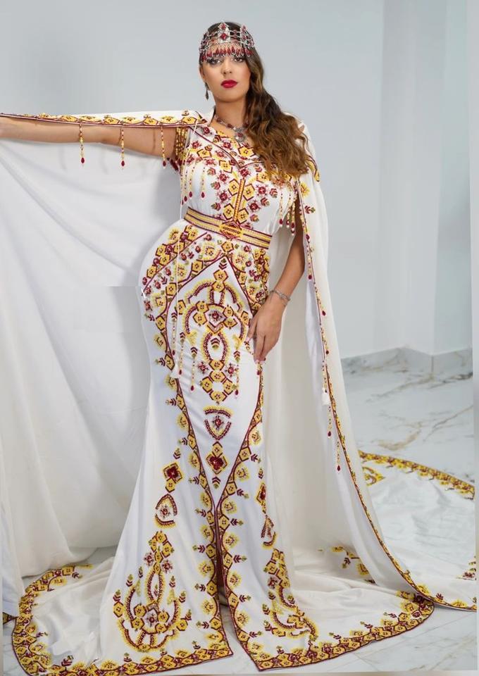 2025@Algerian Traditional Wedding White Caftan & Veil Dress with Embellished Crystal Glass Beads, stone, Pearls ,Dabka Work