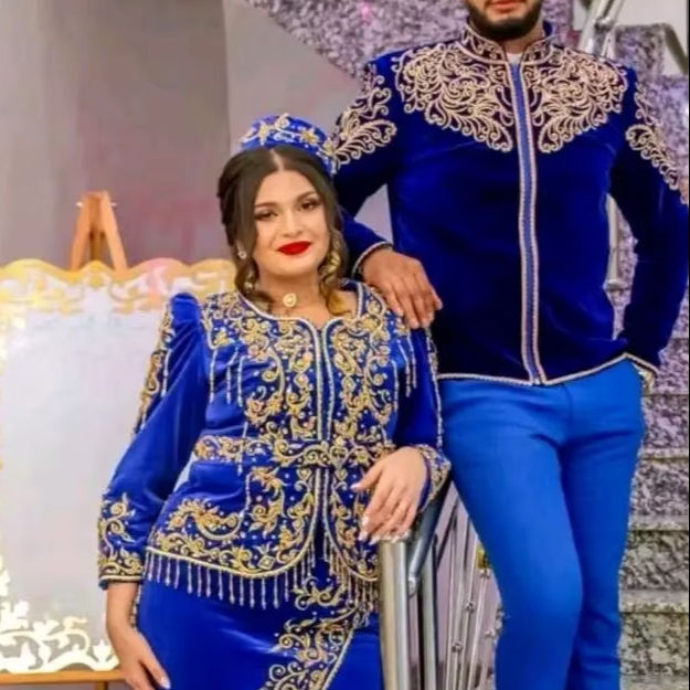 2025 @ Algerian Wedding Royal-Blue Women's & Men's Groom Dresses With Embellished Crystal Glass Beads, stone, Pearl ,Dabka Work