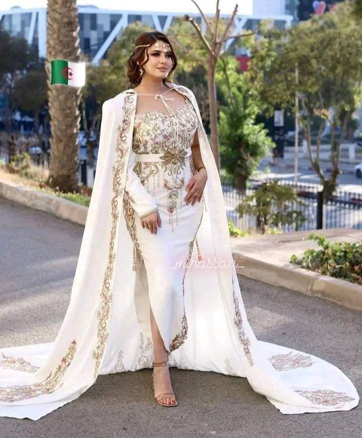 2025@Algerian women's White Badroune with Barnose With heavy Embellished Crystal Glass Beads, stone, Pearl ,Dabka hand Zari Work