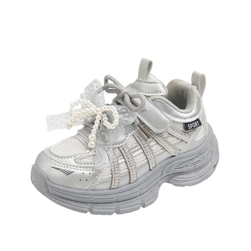 2025 Autumn Girls' Sports Shoes with Pearl Bow New Style Fashionable Casual Breathable Mesh Boys' School Dad Shoes