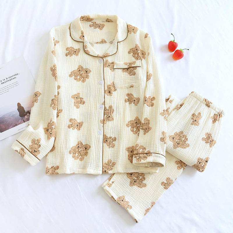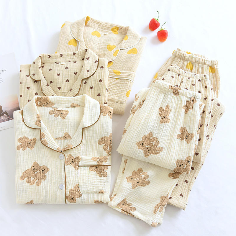 2025 Autumn Women's Cotton Crepe Pajamas Double-layer Gauze Long Sleeved Pants Set Heart Printed Casual Home Clothes Sleepwear