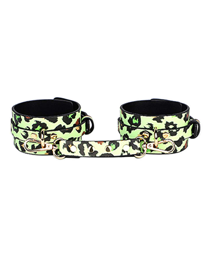 2025 BDSM lumineux imprimé léopard 7 pièces Bondage ensemble menottes fouet bouche Gag bandeau collier mâle et femelle jouets sexuels