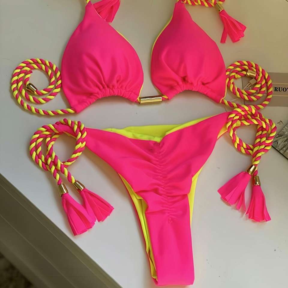 Ensemble de maillots de bain 2 pièces pour femme 2025, dos nu, en corde tressée, avec appliques en dentelle et strass, à pampilles, sexy et luxueux, pour la plage