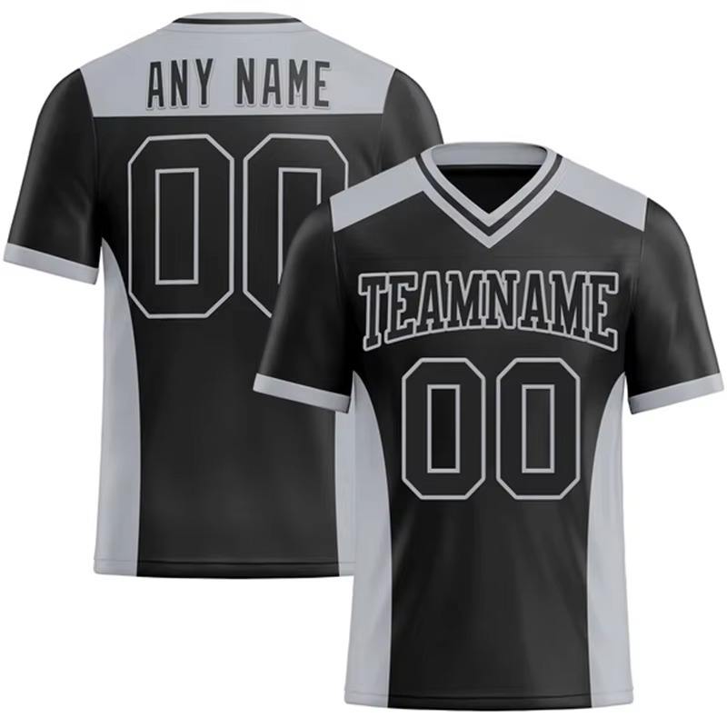 Maillot de football américain personnalisé 2025 respirant 100 % polyester noir et blanc, uniforme à manches courtes personnalisable pour hommes