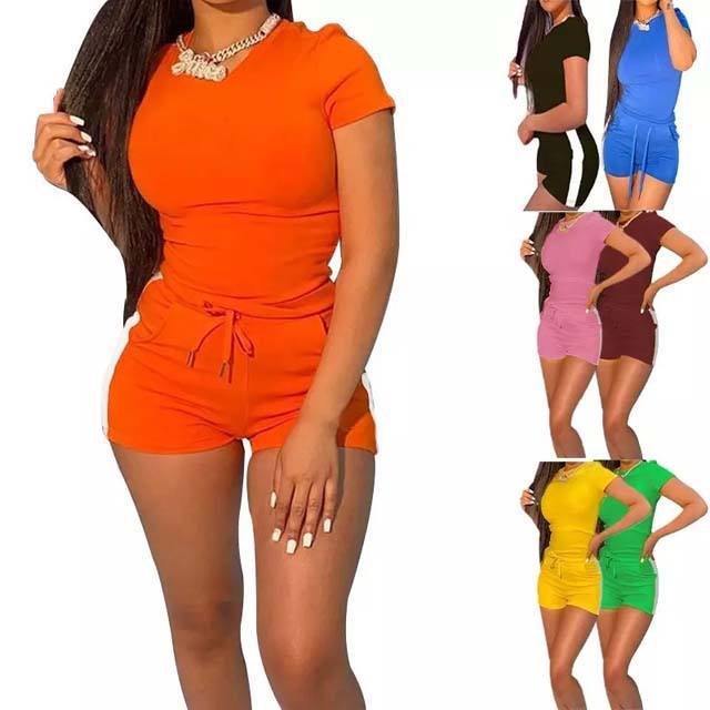 2025 Logo personnalisé femmes été mode ajusté décontracté couleur unie survêtement ensembles T-shirt et Shorts sport deux pièces ensemble court