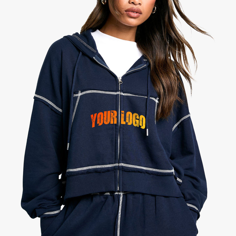 2025 sur mesure haut court fermeture éclair contraste point femmes sweats à capuche goutte épaule léger 100% coton polaire sweats à capuche pour les femmes