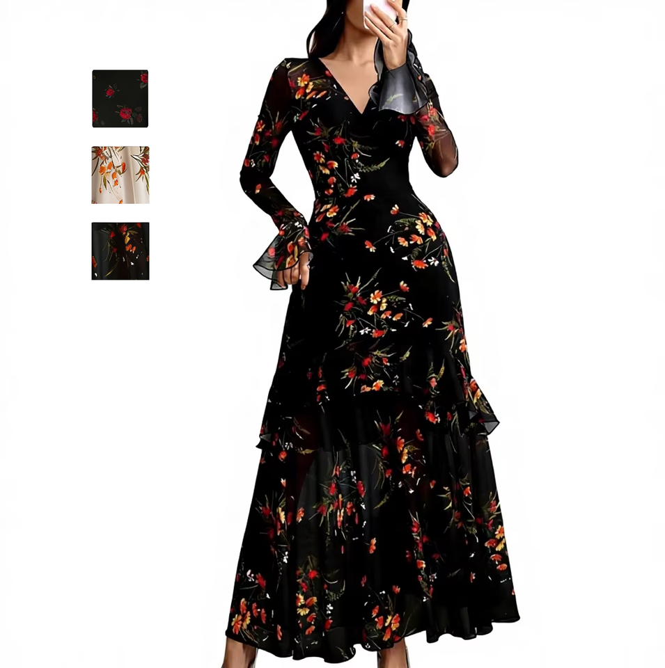 Robe longue maxi élégante pour femme, col en V, manches longues, imprimé floral romantique, en mousseline, coupe ajustée, collection 2025