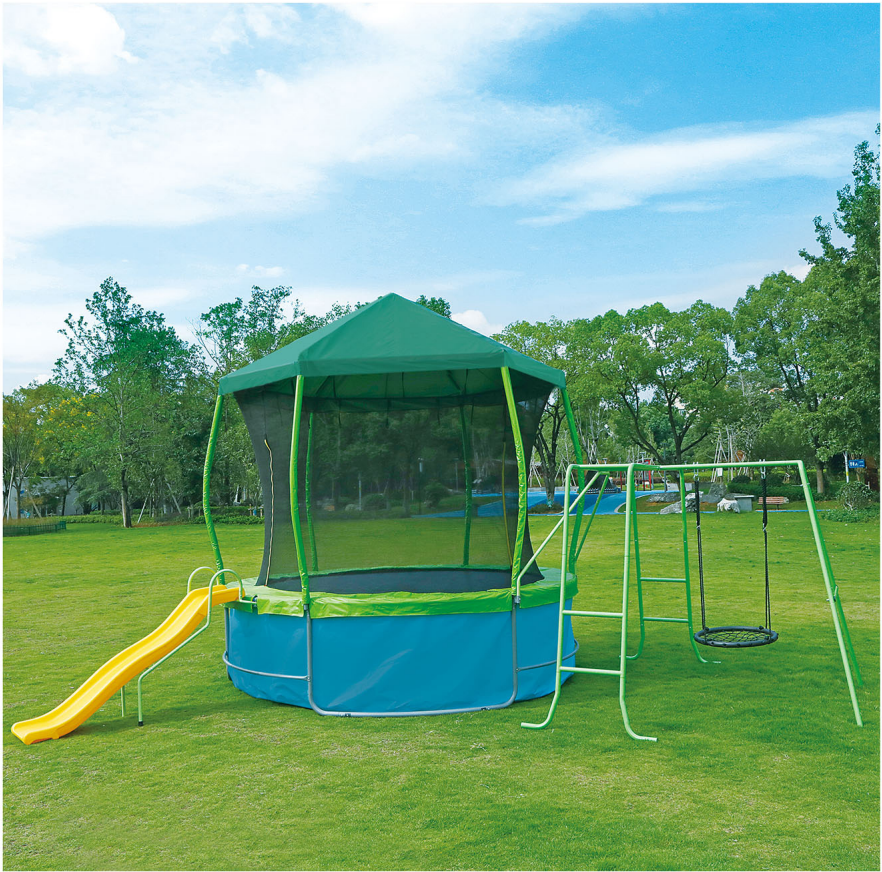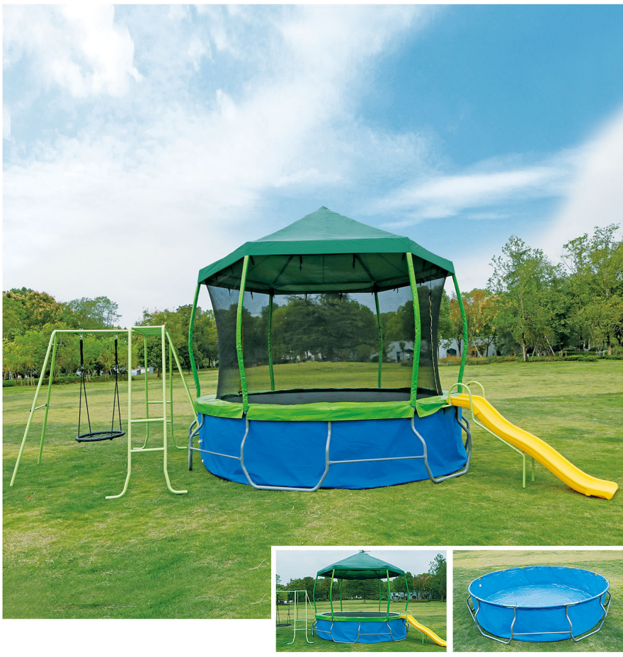 2025 personnalisé nouveau Design balançoire piscine toboggan 3 en 1 PP PVC aire de jeux extérieure parc de trampoline pour enfants avec abri contre la pluie
