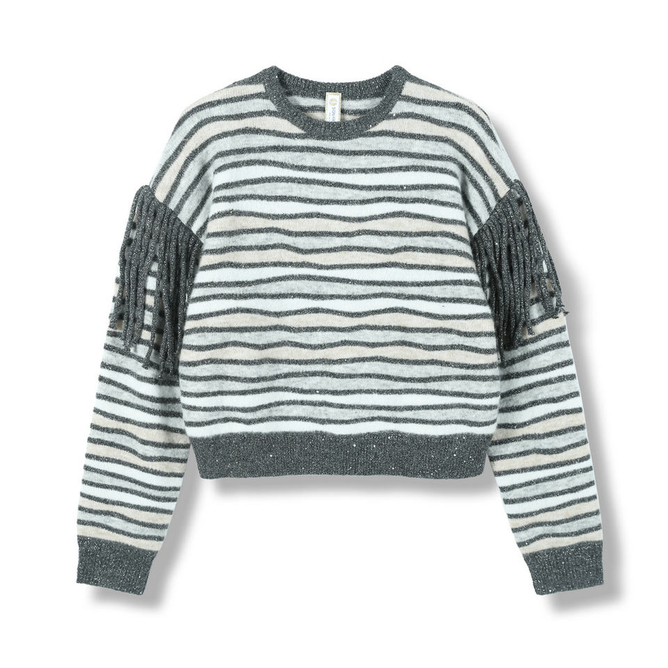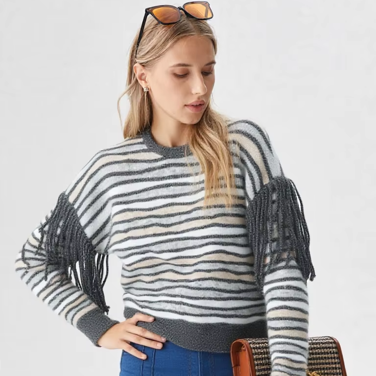 2025 personnalisé OEM & ODM dames automne hiver col rond à manches longues pull ondulé rayures tricot pull frange conception pull