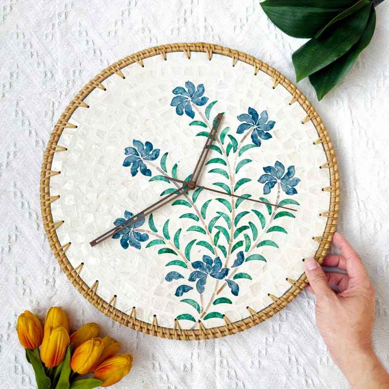 2025 Elegant Natural Mother of Pearl and Wicker Rattan Wall Hanging Clock Rattan Clock for Home Decoration Made in Vietnam