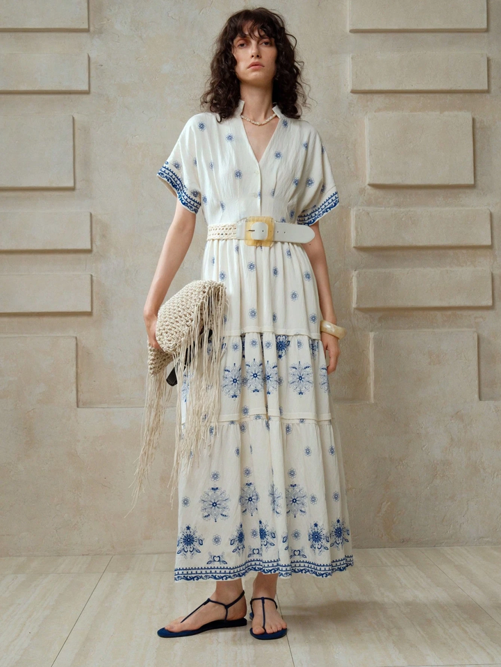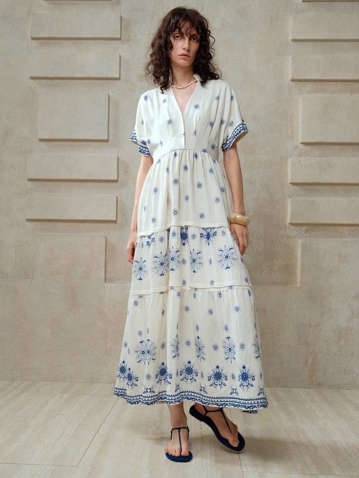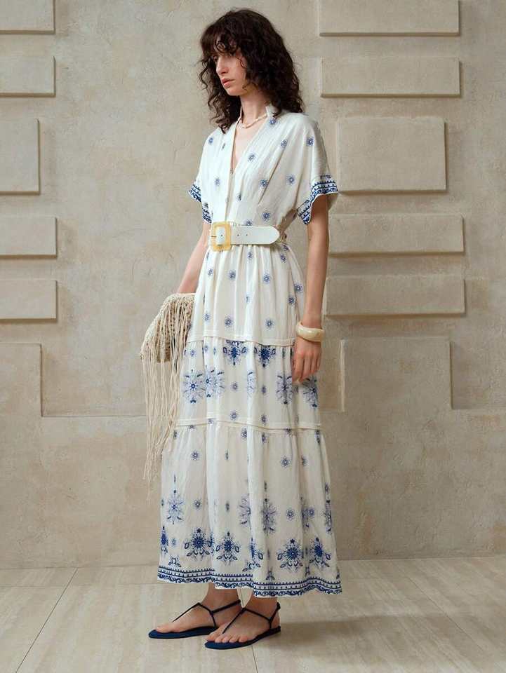 2025 Fashion Most Sale Mexican Maxi Dress 100% Cotton Woven Embroidered Colorful Peacocks Vintage Look Hippie Folk Sun Dress
