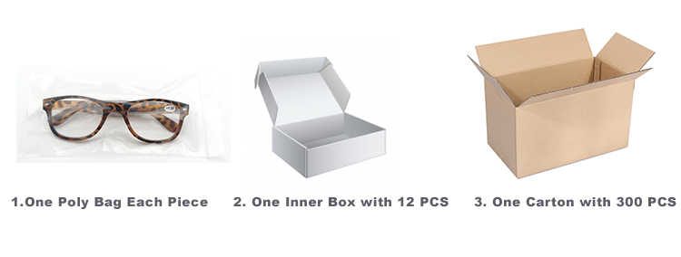 Package:left temple with mini polybag,12PCS/inner box,300PCS/Carton.Carton size 80*30*36,G.W.12KGS