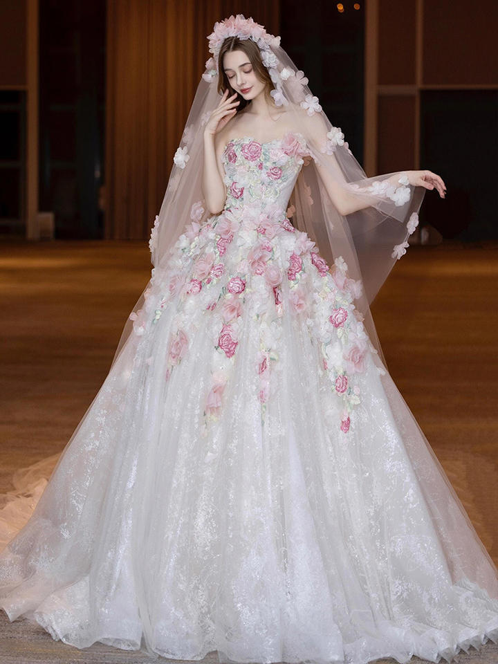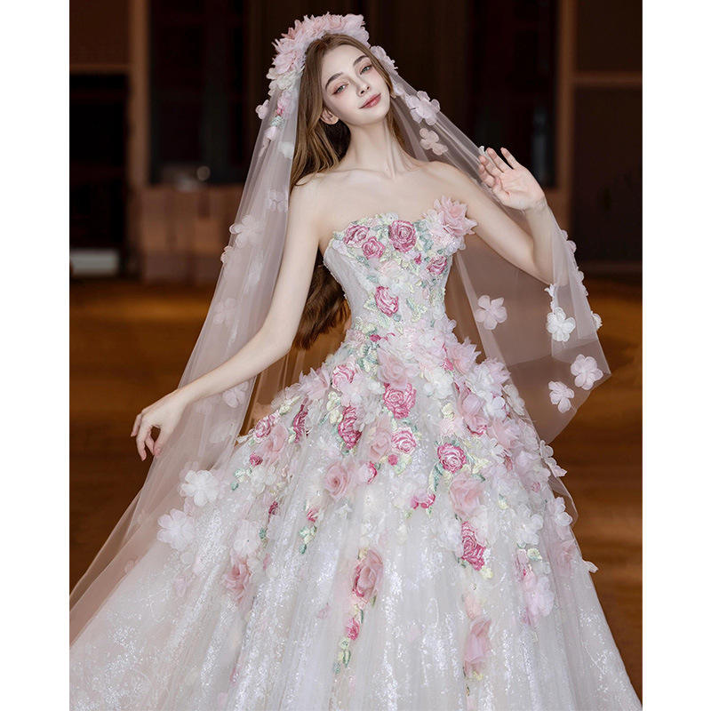 2025 robe de mariée faite à la main de style forêt pour femmes robe de fiançailles sans bretelles avec train chapelle classique et voile