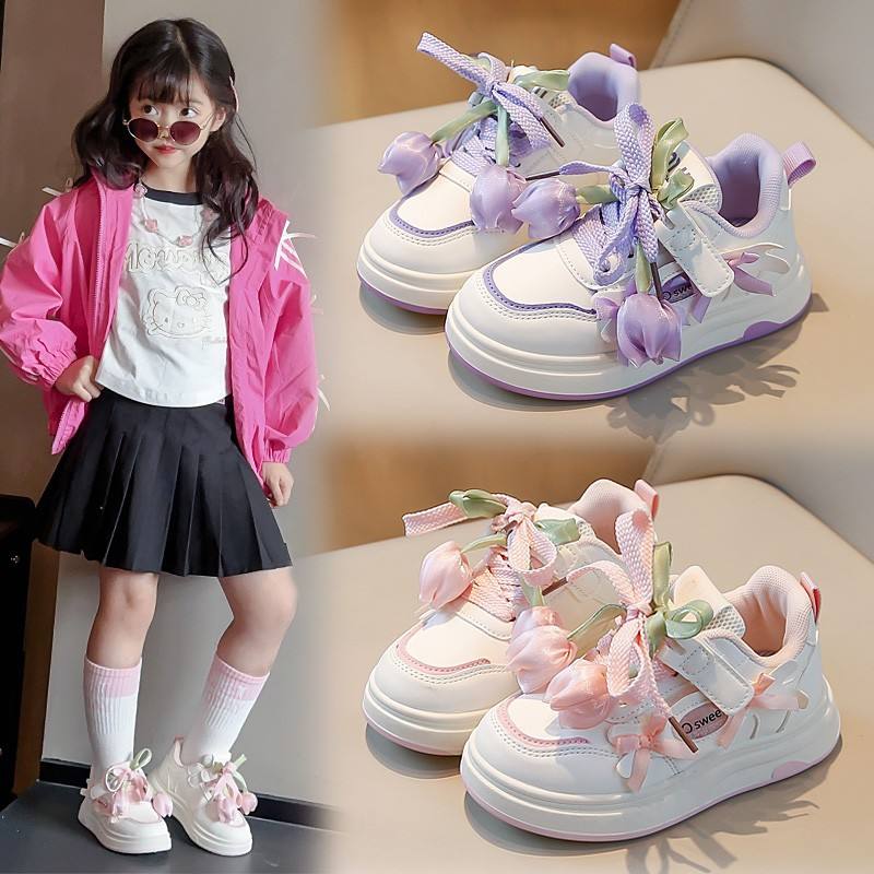 2025 Girls' Sneakers Stylish Bow Casual Violet Pink Sports Running Shoes Spring Autumn Lighted Children's Unique Flower Design
