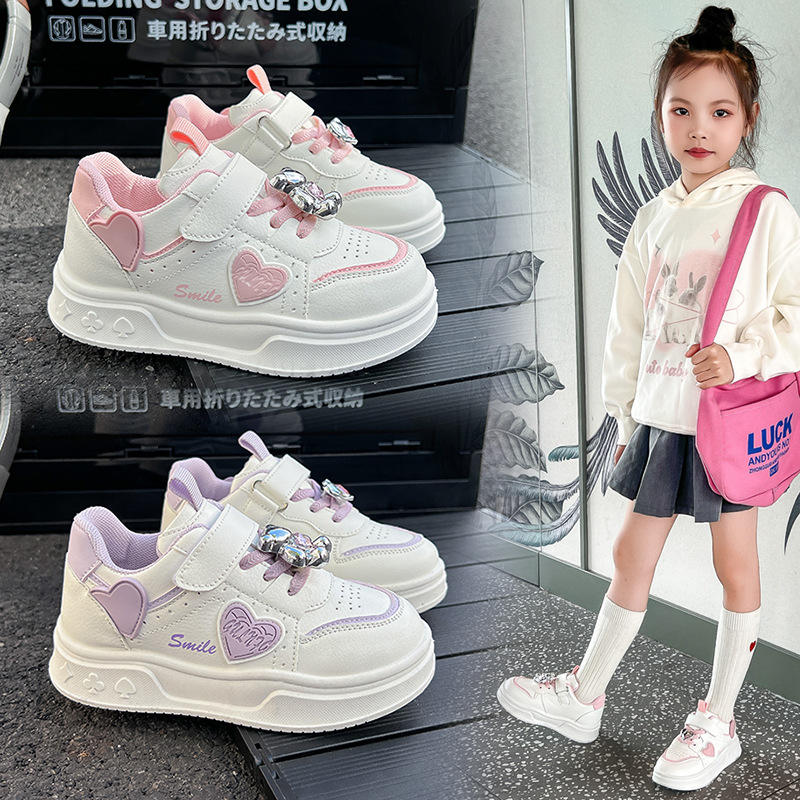 2025 Girls' White Sports Sneakers with Bear Love Design Soft Sole Casual Shoes for Spring Autumn Lighted Feature