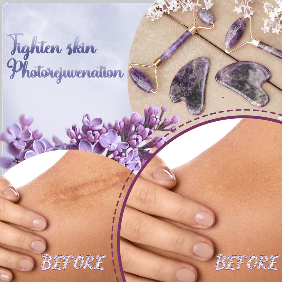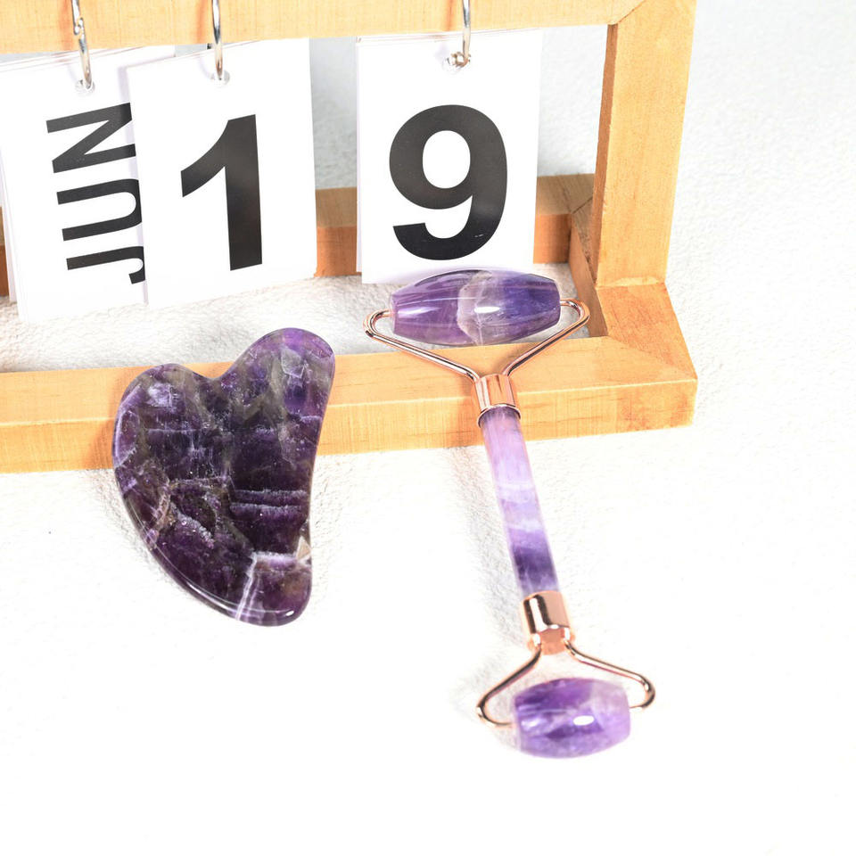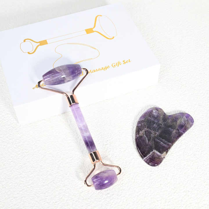 Ensemble Gua Sha 2025 : Rouleau de jade pour le visage en améthyste avec cadre doré et Gua Sha en forme de cœur en améthyste, rouleau vibrant pour le visage pour les bienfaits de la peau
