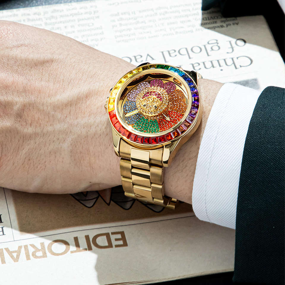 2025 luxe hommes en acier inoxydable mécanique montre tournesol coloré diamant résistant à l'eau 22mm bande Hip Hop Style