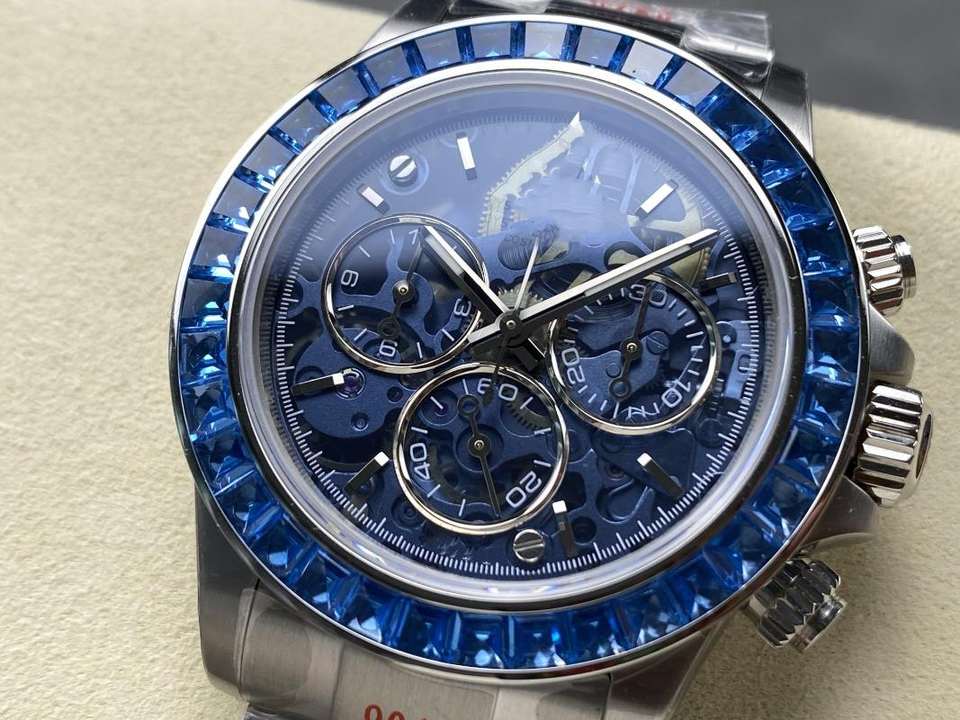 2025 montre mécanique de luxe haut de gamme pour hommes avec lunette en diamant bleu, chronographe squelette et bracelet en acier