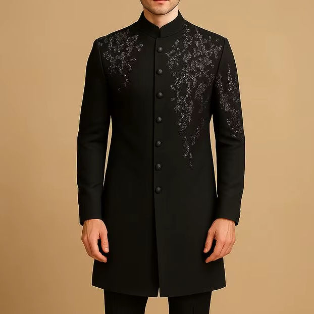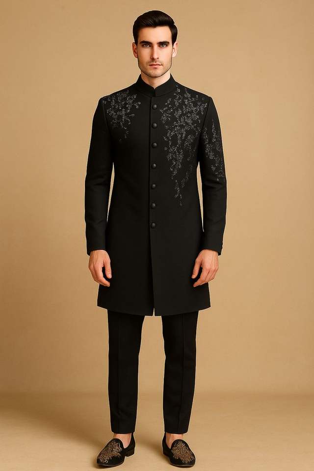 2025 @ Latest Sherwani et pantalon noirs personnalisés pour hommes ornés de perles de verre en cristal, travail manuel Dabka pour mariage/fête