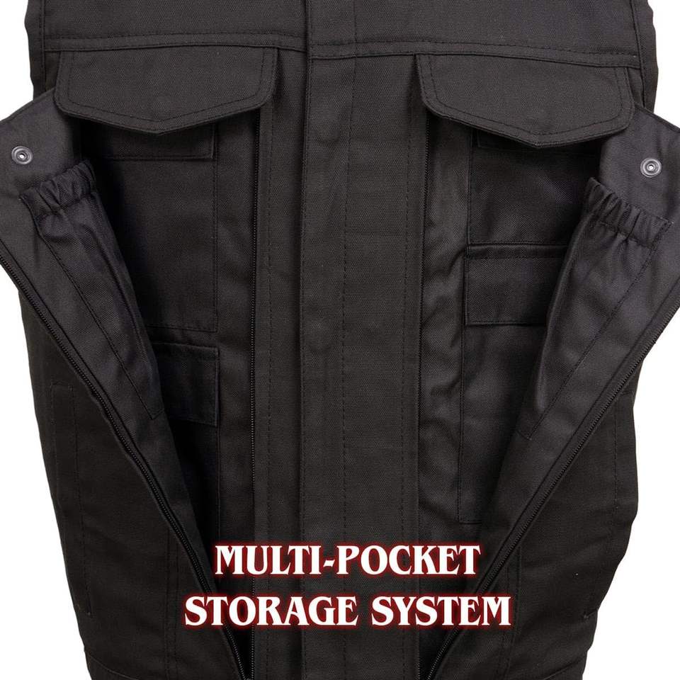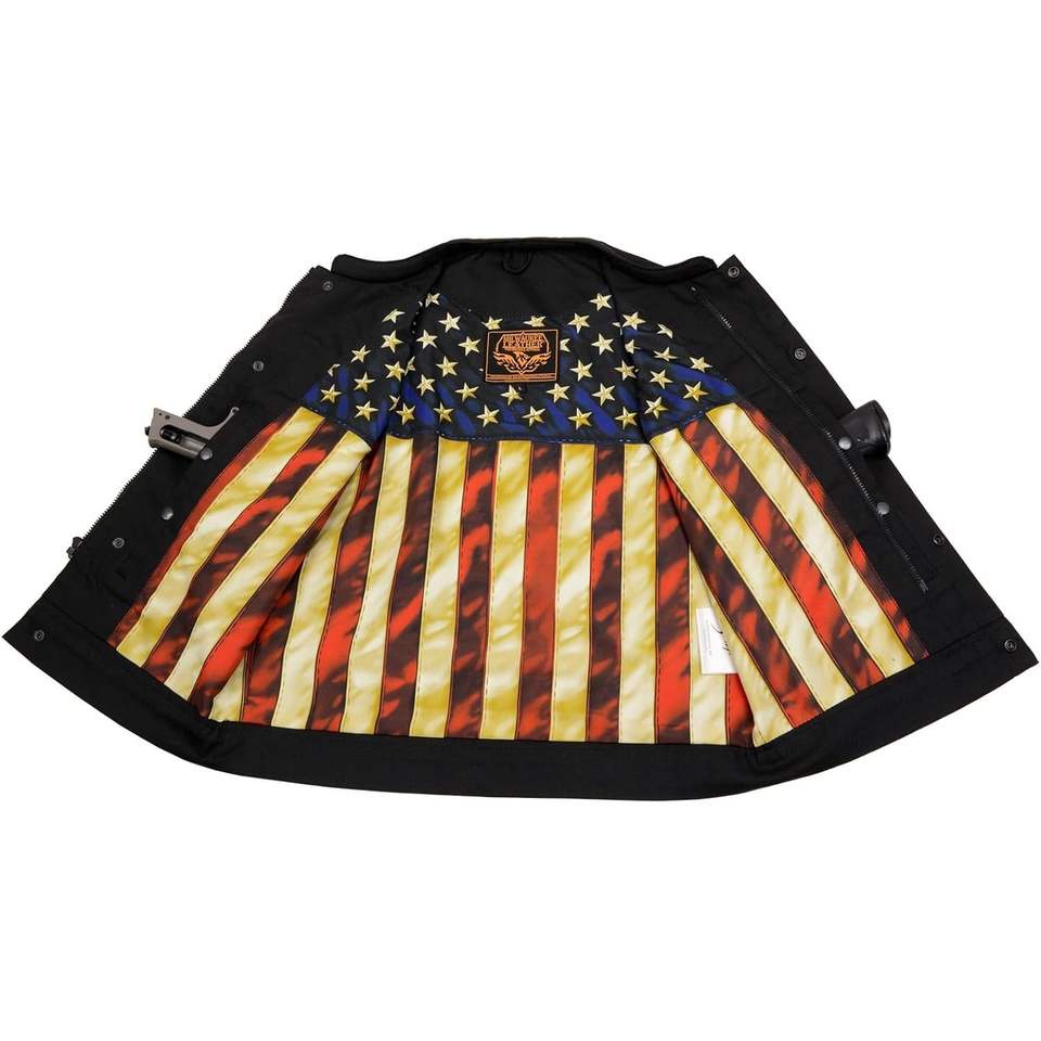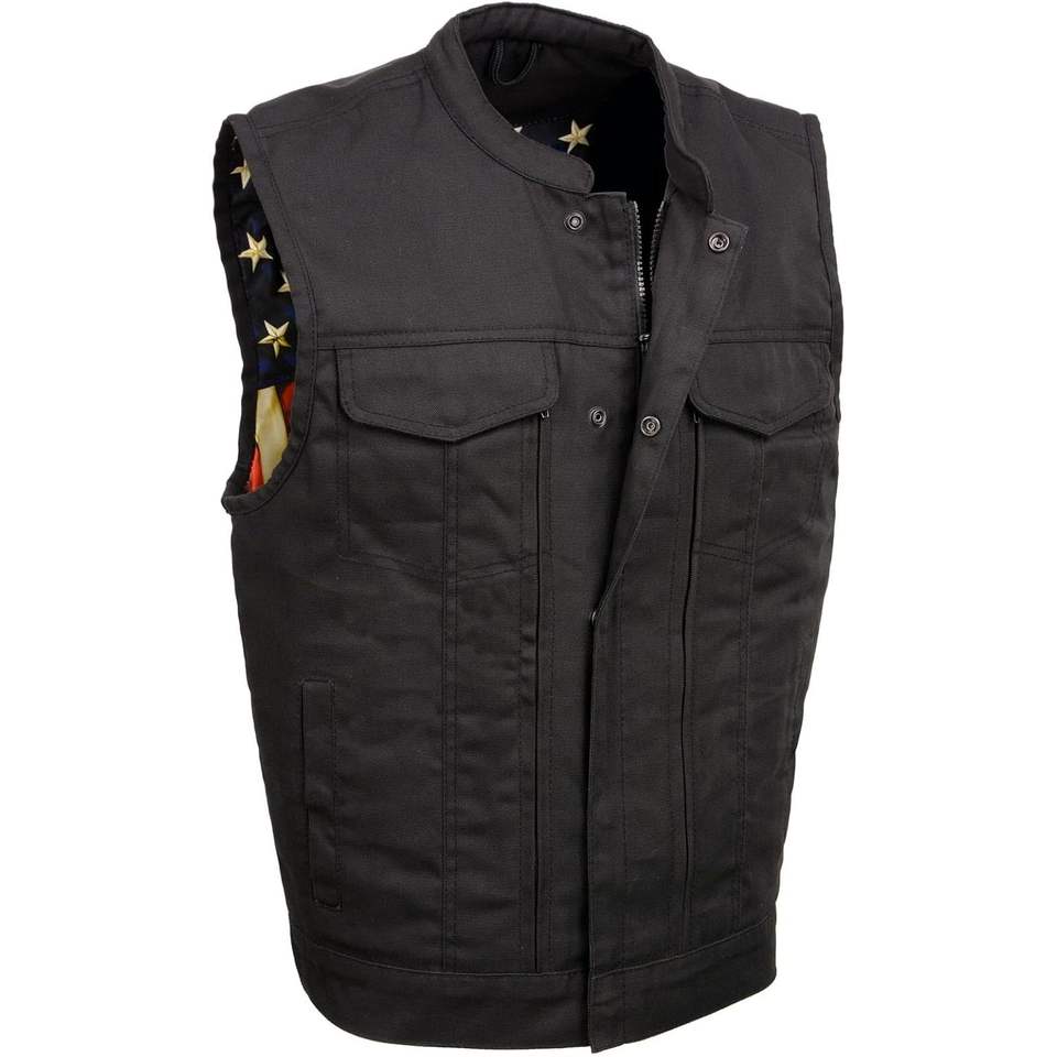 2025 Leather MDM3007 Men's 'Brute' Vest Black Denim Club Style USA Flag Liner Concealed Snap Motorcycle Auto Racing Wear