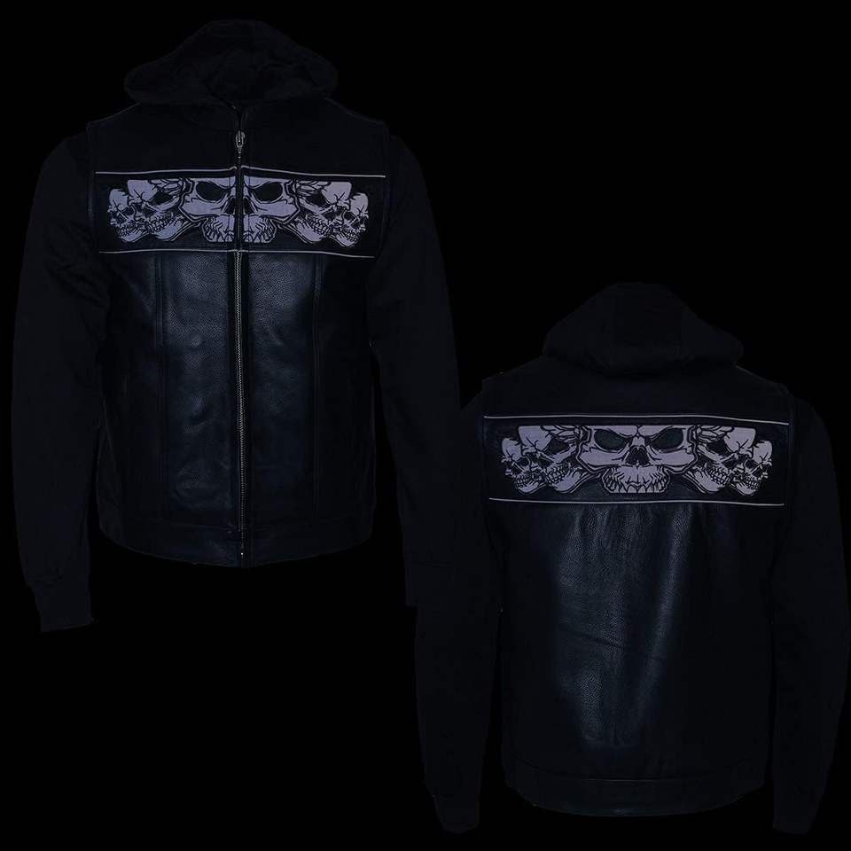 2025 cuir MLM3563 hommes crânes réfléchissants 2-en-1 gilet noir moto et course automobile avec sweat à capuche amovible