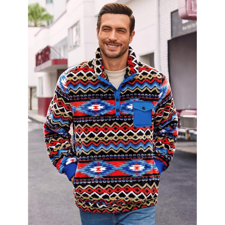 2025 hommes motif aztèque polaire veste Vintage Style occidental hiver pull Sherpa floue doublure poches extérieur polaire