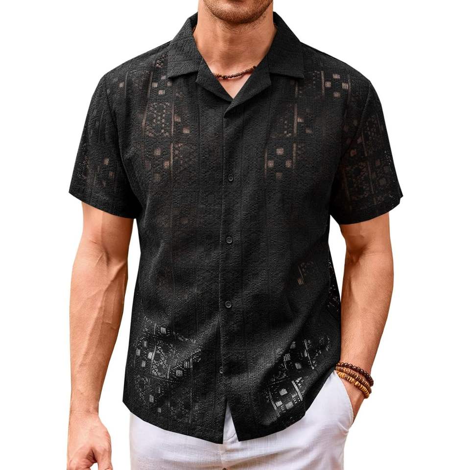 2025 Men's Casual Cotton Shirt with Lace Button Down Cuban Collar Short Sleeve and Hollow Out Design Summer Tops