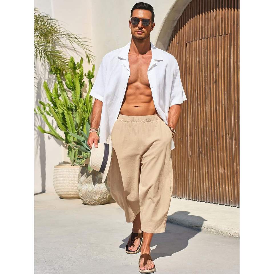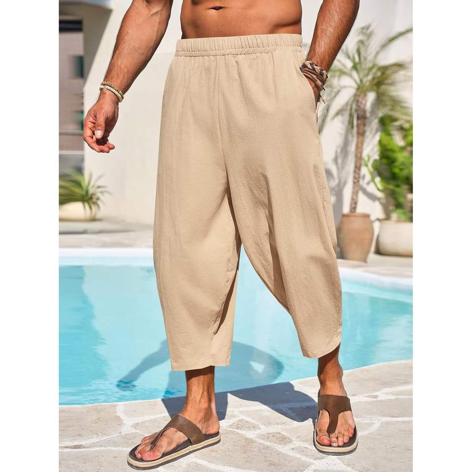 2025 Men's Cotton Harem Capri Pants 3/4 Beach Shorts Customizable Yoga Beach Baggy Casual Elastic Waist Hippie Boho Style